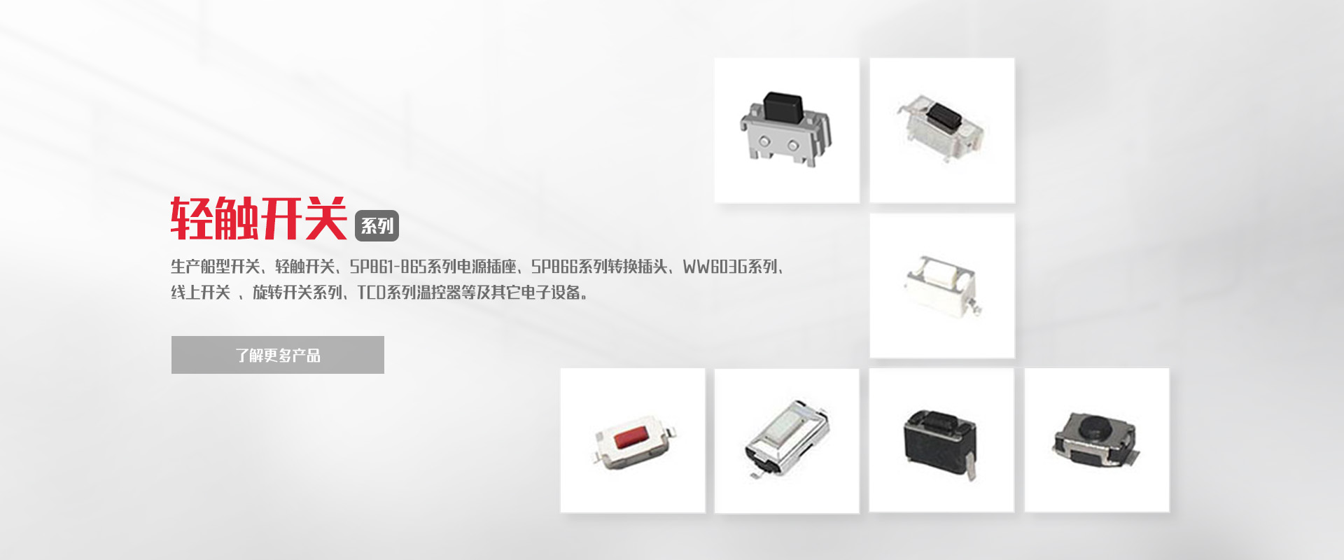 公司專業(yè)生產(chǎn)船型開關(guān)、輕觸開關(guān)、SP861-865系列電源插座、SP866系列轉(zhuǎn)換插頭、WW11系列微動開關(guān)、WW01-03、09系列按鈕開關(guān)DS、WW系列指示燈開關(guān)、WW603G系列 線上開關(guān) 、旋轉(zhuǎn)開關(guān)系列、TCD系列溫控器等及其它電子設(shè)備。